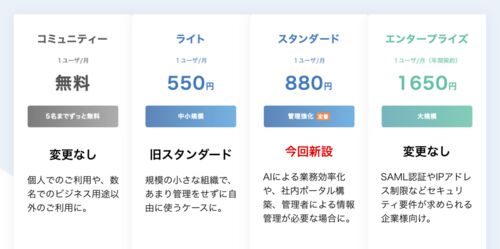 本日、Kibela全体のプラン構成を見直し、新しいプランを追加しました。これまでの3プラン構成から、以下の4プラン構成に変更しています。 コミュニティ ライト(旧スタンダード) スタンダード(新設) エンタープライズ スタンダードプラン(新設)について…